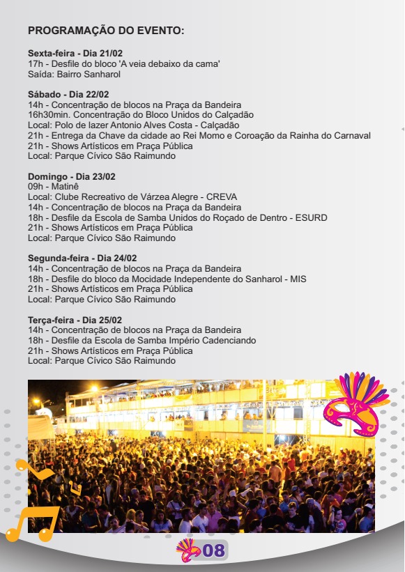 Este ano a gente não vai ficar nas calçadas tacando a farinha de casa na cara do povo. Quem não for sair do Cariri no Carnaval, simbora para Várzea Alegre. Como todos os anos, a cidade comemora a folia de Carnaval com shows, desfiles e bloquinhos, que começam no sábado, 22, e terminam na terça de carnaval, 25. Bem que podia terminar só na quarta, aí eu ficava só as cinzas.